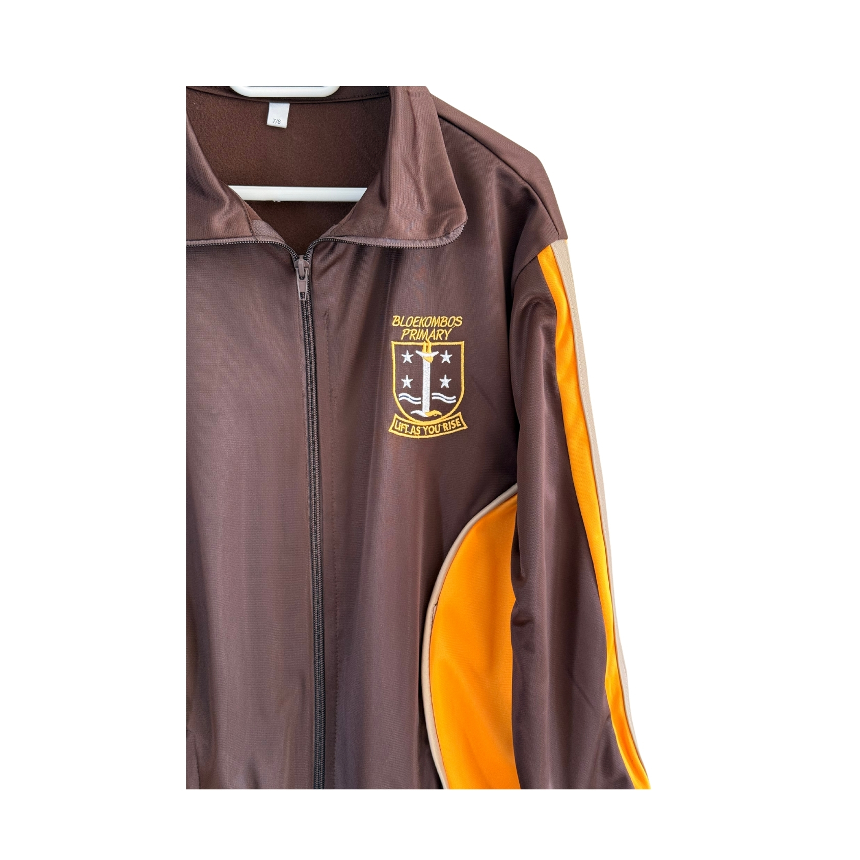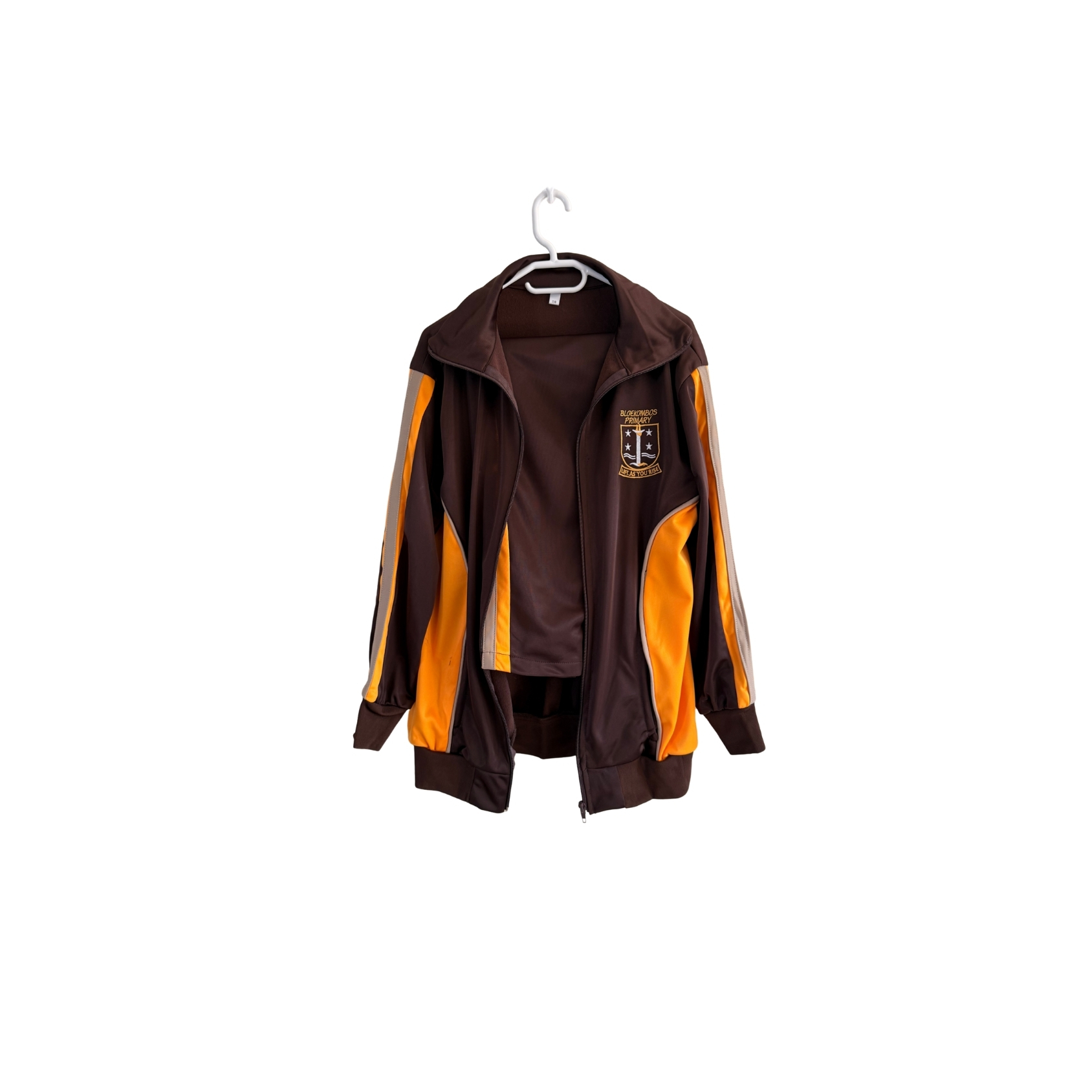 Motto: “Lift As You Rise” A comfortable, durable school tracksuit top proudly made in our small factory — featuring the Bloekombos Primary badge and gold trim design.